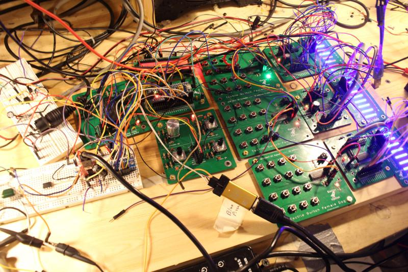 To the right you can see the PCBs with 16 switches each. These, too, were prototype tools I developed. I need to look up the chip. I used a SPI expander so that I could have a ton of buttons with only only the CS, MOSI, MISO traces.